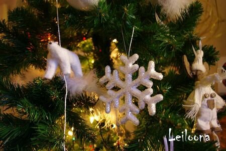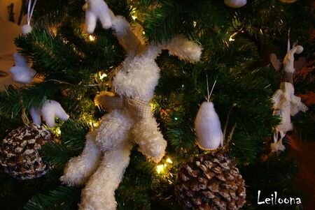 Cette année, un sapin tout blanc qui me fait irrésistiblement penser à une chanson apprise à l’école primaire. Il y était question de Noël blanc dans le Désert … Je ne retrouve pas cette chanson, donc si vous la connaissiez, je serais capable de vous pleurer dans les bras (oui, cela fait de nombreuses années que je la cherche, je suis émotive ..)